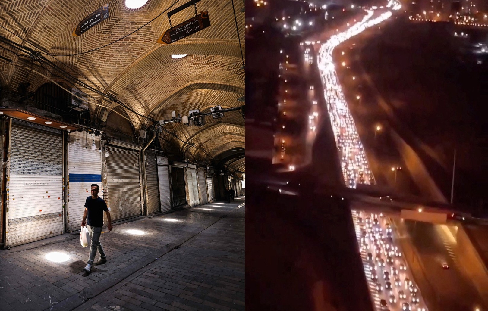 문을 닫은 테헤란 그랜드 바자르의 상점들과 차들로 가득찬 카라즈-찰루스 도로. AFP 연합뉴스