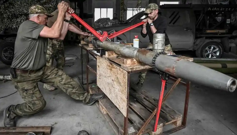 그라드 다연장 로켓포탄을 분해 중인 우크라이나의 고령자 자원봉사자들. 로이터 연합뉴스 자료사진