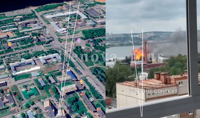 우크라이나군이 7월 1일 러시아 이젭스크 쿠폴 전자기계공장을 드론으로 타격한 직후 화염과 연기가 치솟는 장면(오른쪽). 위성사진으로 지리 좌표가 확인된 공장 위치와 일치한다(왼쪽). 사진=오픈소스 자료
