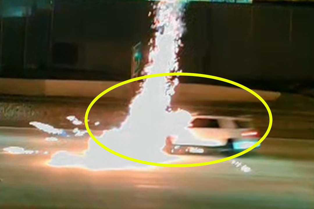 영상을 보면 촬영자가 놀란 듯 파편이 떨어지는 곳을 손으로 가리키고, 차량은 도로 위에서 갑자기 떨어진 폭죽을 그대로 뚫고 지나갑니다.