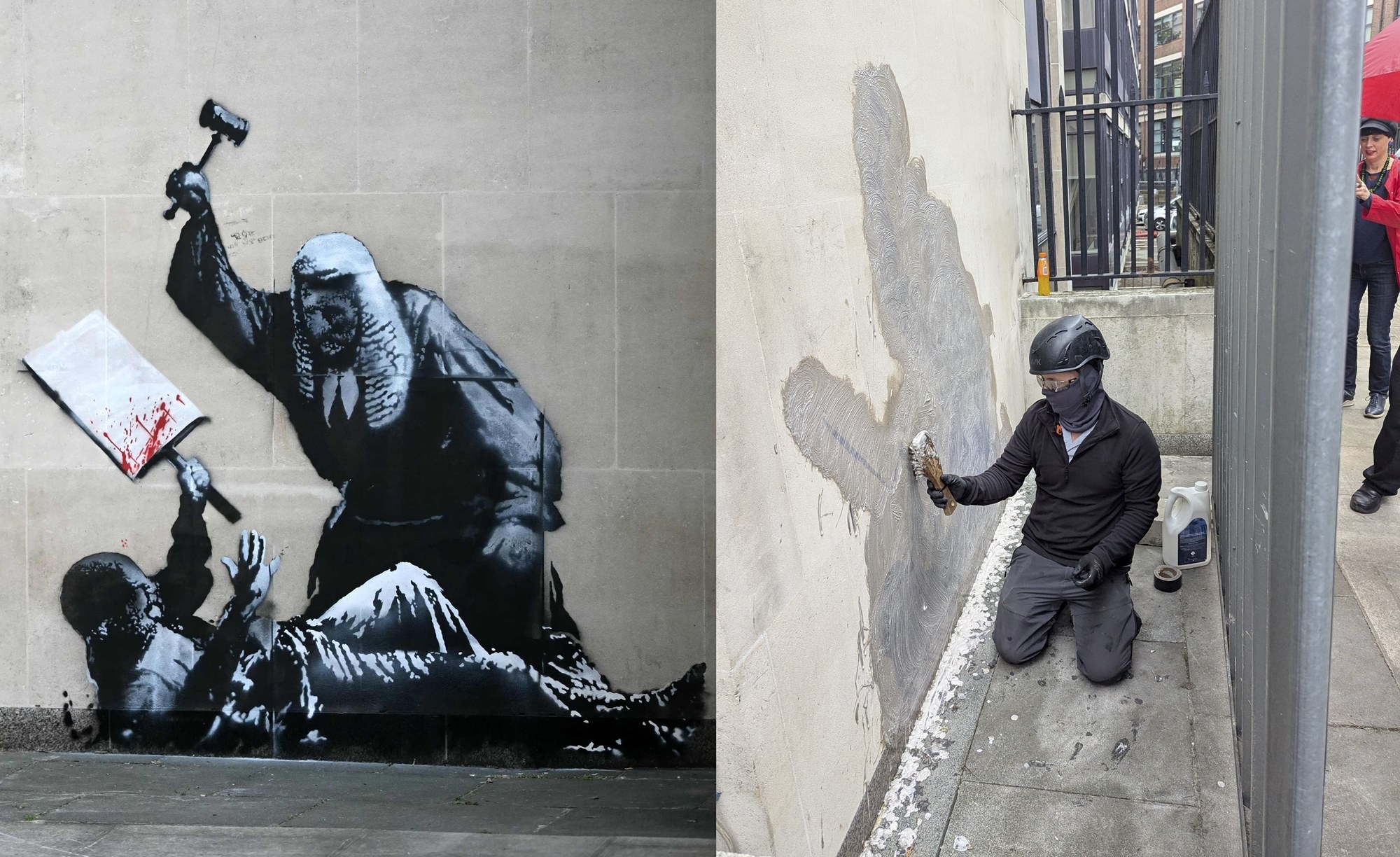 영국 런던의 법원 외벽에 그려진 뱅크시 벽화와 이를 지우는 모습. AP 연합뉴스