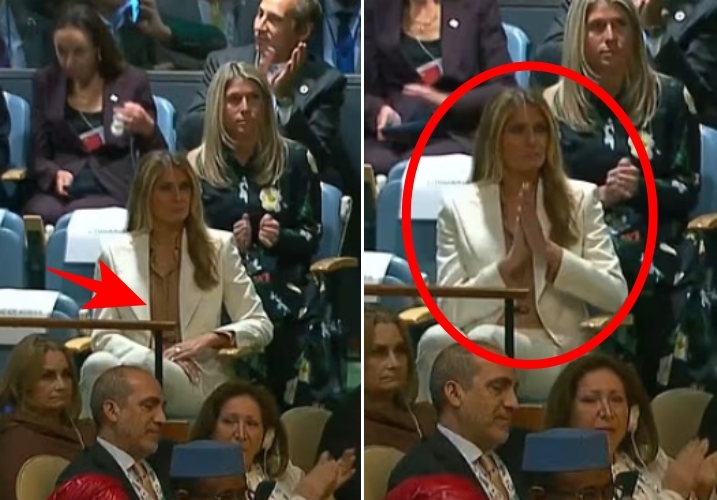 도널드 트럼프 미국 대통령이 지난 23일(현지시간) 유엔 총회에서 연설하는 동안 불만족스러운 표정을 짓고 있던 멜라니아 여사의 행동이 카메라에 포착됐다.