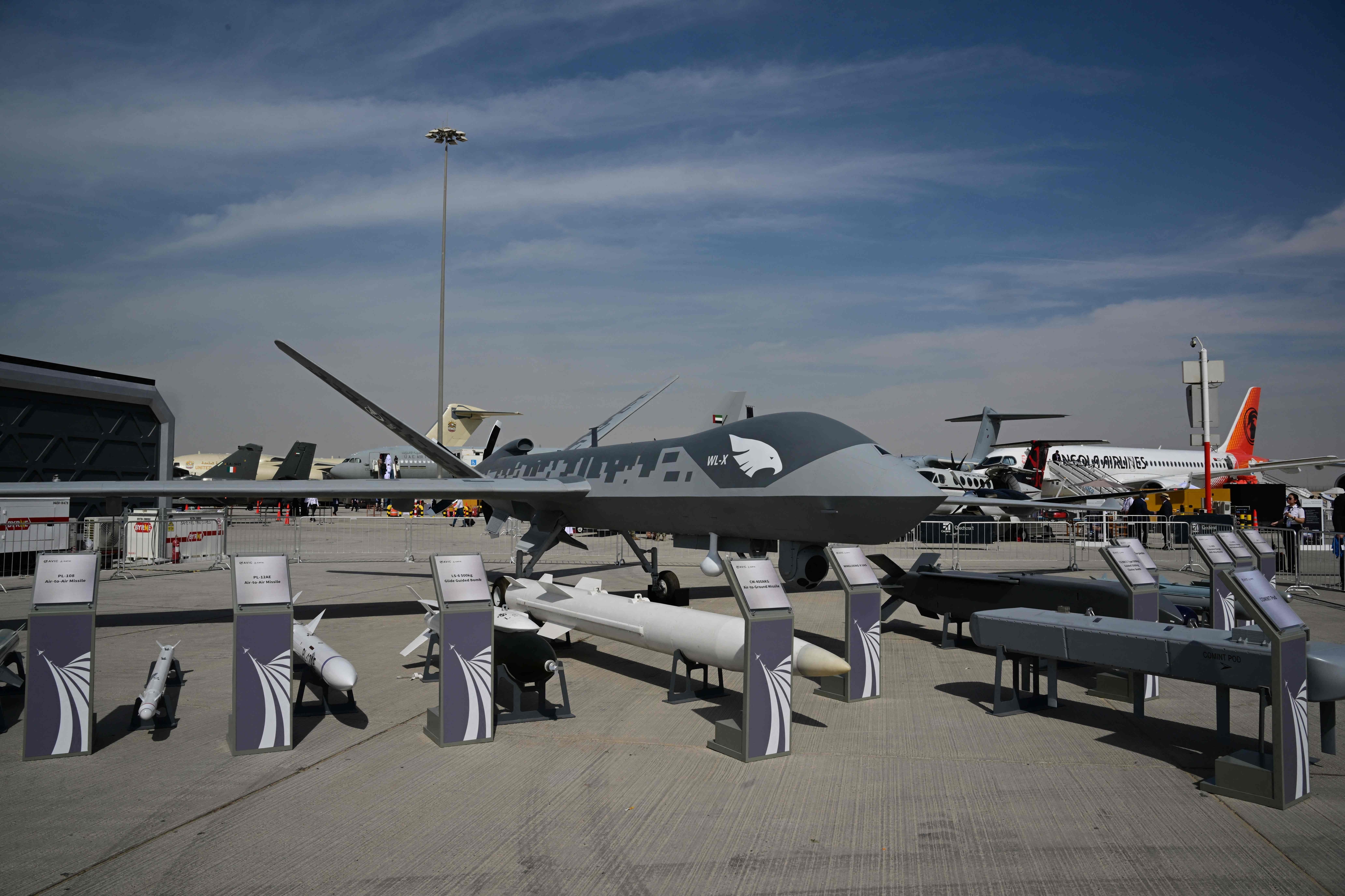 중국 국영 방산기업 CATIC이 선보인 무인기 ‘윙룽-X’ 실물 크기 모형이 2025년 11월 17일(현지시간) 아랍에미리트 두바이 알막툼 국제공항에서 열린 두바이 에어쇼 현장에 전시돼 있다. AFP 연합뉴스
