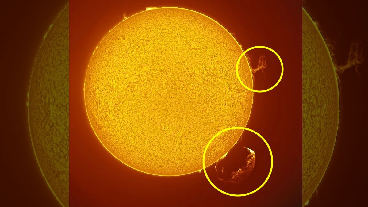 태양에서 벌어진 두 현상 모두 보이지 않는 자기장의 교란으로 발생하지만 서로 다른 특징이 있다. 먼저 태양 토네이도는 표면에서 거대한 플라스마가 폭발하면서 생기는데, 분출한 플라스마 입자가 자기장의 변동에 따라 나선형으로 회전해 회오리바람처럼 보인다. 홍염은 태양 내부에서 맹렬한 힘으로 분출된 물질이 표면 위로 솟아 올라갔다가 가라앉는 현상이다. 특히 홍염은 이 과정에서 물질을 방출하는 데 이를 ‘코로나 질량 방출’(CME)이라고 부른다. CME는 인공위성은 물론 지구상의 전력망, 통신 시설에 악영향을 주거나 극지 부근에 오로라를 발생시킬 수도 있다.