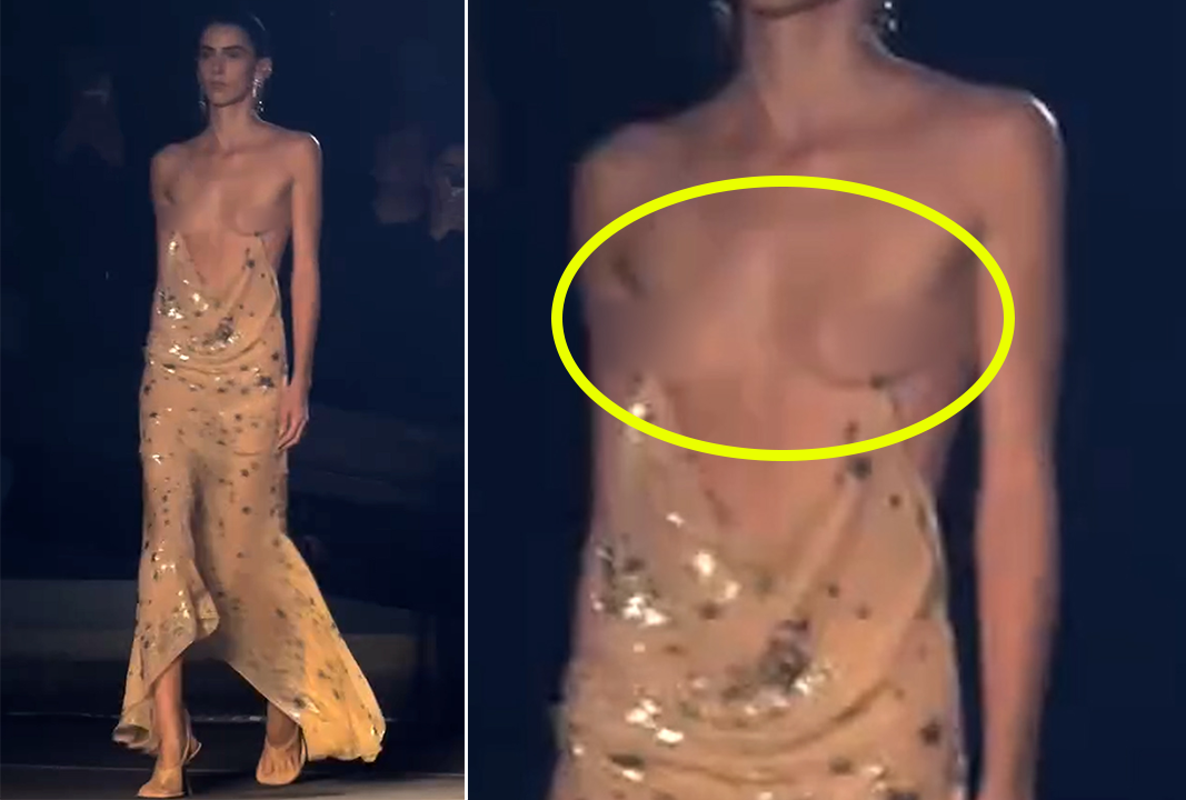 문제가 된 드레스는 은빛 별 장식이 뿌려진 얇은 시폰 소재로, 모델의 유두 피어싱에 끈을 걸어 고정하는 구조입니다. 이로 인해 모델의 가슴이 그대로 노출됐는데요.