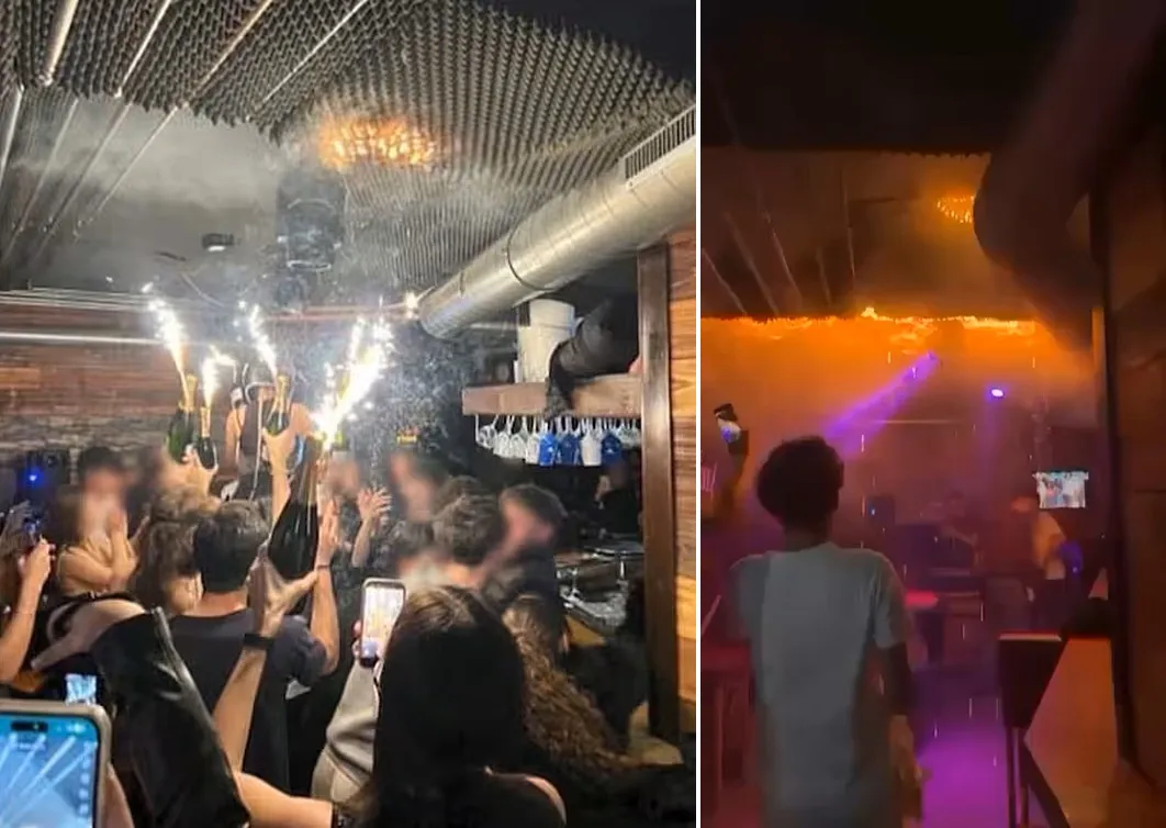 (왼쪽) 샴페인 병에 꽂은 폭죽 불꽃이 스위스 크랑스-몽타나의 한 나이트클럽 천장 마감재로 옮겨붙는 순간을 담은 사진. (오른쪽) 밀폐된 지하 공간에서 극심한 열로 내부 가연물이 거의 동시에 점화되는 ‘플래시오버’ 현상이 발생한 당시 모습. 이 화재로 다수의 인명 피해가 발생했다.