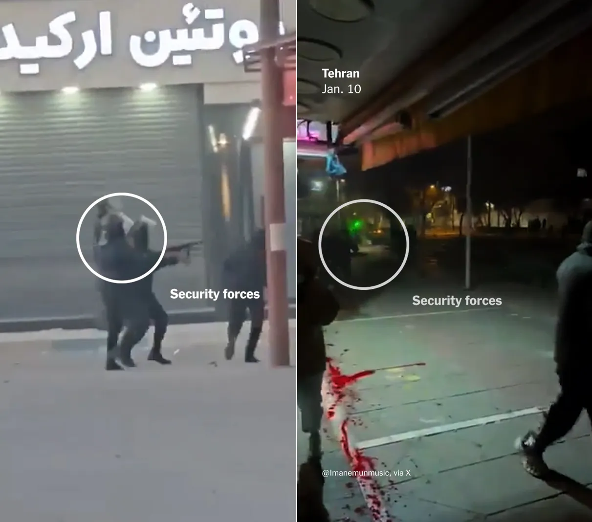 이란 시위 진압을 다룬 뉴욕타임스(NYT) 탐사 보도 화면. NYT는 여러 도시에서 보안군이 시위대를 향해 무력을 사용한 장면이 담긴 영상을 검증해 공개했다.