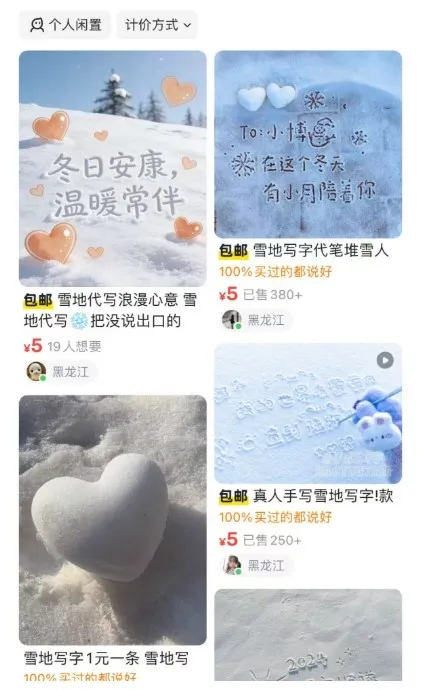 30일 중국 언론 신주간에 따르면, 최근 중국 북부 지역을 중심으로 ‘눈밭 대필’이라는 이색 부업이 등장했다. 하얗게 쌓인 눈 위에 소비자가 원하는 문구를 대신 써주고, 이를 사진이나 영상으로 촬영해 전달하는 방식이다. 가격은 몇 위안부터 비싸게는 세 자릿수까지 다양하다. 생일 축하, 고백, 새해 다짐 등 어떤 문구든 눈밭만 있으면 특별한 장면이 완성된다.