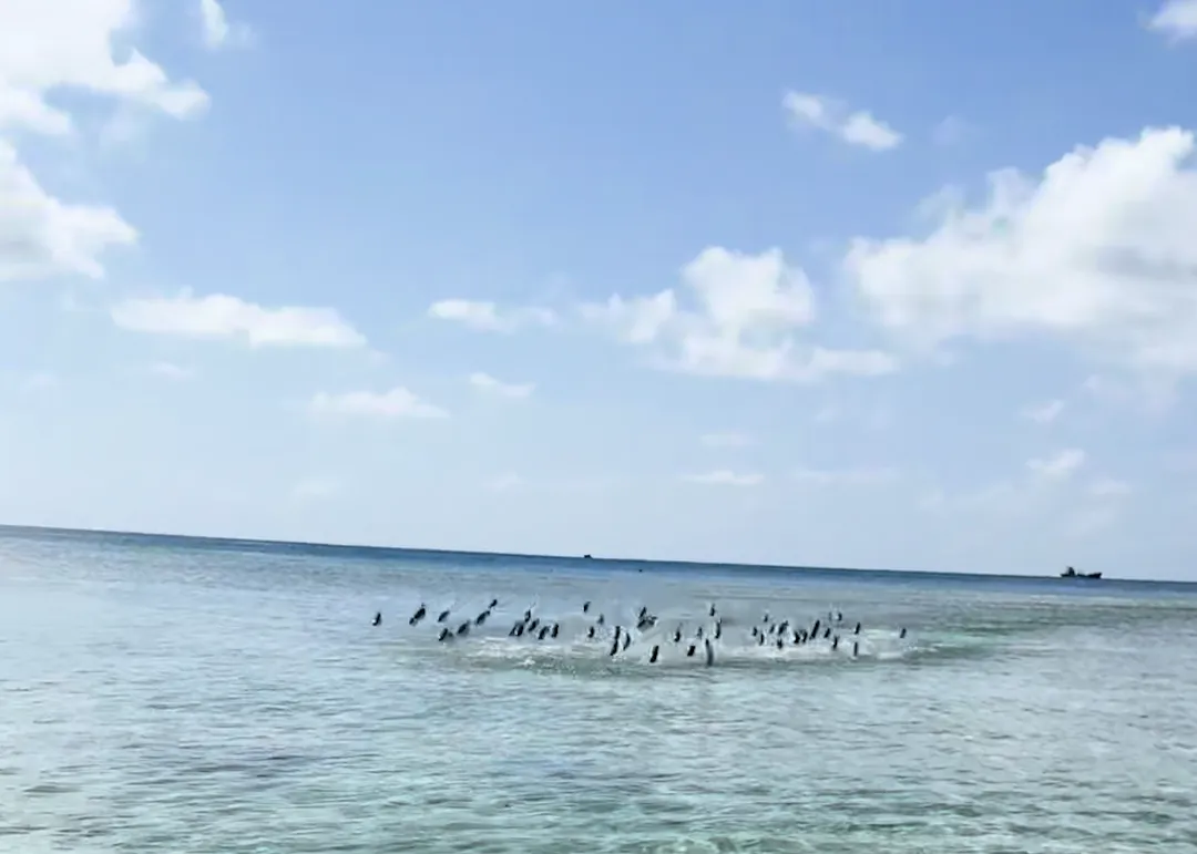 촬영자는 잔잔하고 투명한 바다를 촬영하며 완벽한 힐링을 즐기는데요. 평화로운 순간도 잠시, 거대한 물고기 떼가 폭발하듯 수면 위로 튀어 오르며 그녀를 향해 돌진했습니다.