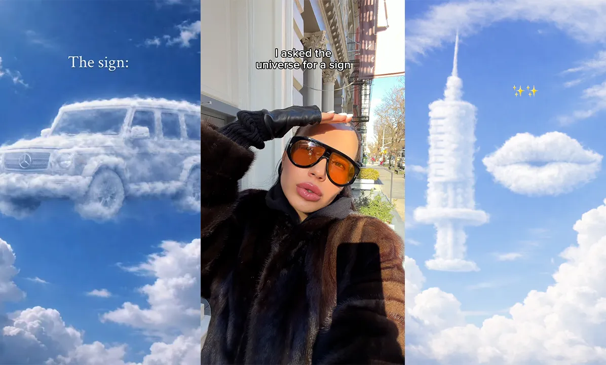 → 이어서 구름이 보이는 하늘 등장. 그런데 구름이 그냥 구름이 아닙니다. 다이아몬드, 에르메스 버킨백, 벤츠 지바겐 등 AI가 만든 화려한 구름 모양.